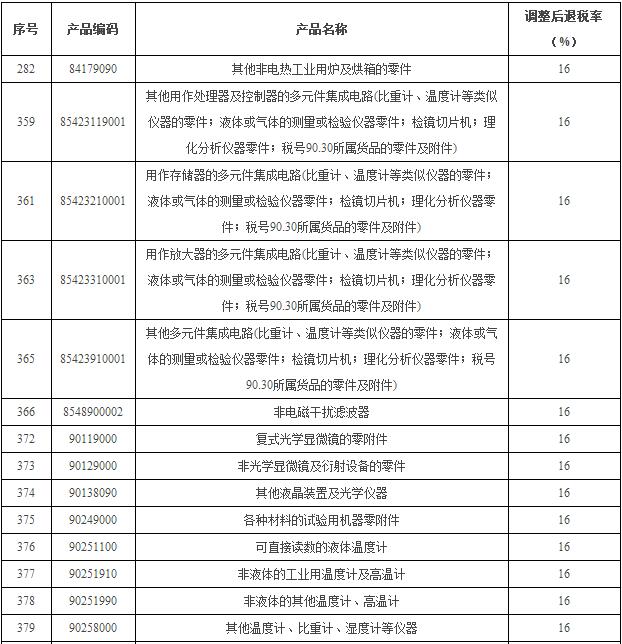 值此中美貿(mào)易戰(zhàn)如火如荼進行的背景之下,財政部于2018年9月5日,公布了《關于提高機電 文化等產(chǎn)品出口退稅率的通知》。通知公示了提高出口退稅率的產(chǎn)品清單,397項機電、文化類產(chǎn)品退稅率得到提升,最高可達16%。其中24項產(chǎn)品與儀器儀表相關,5項屬于理化分析儀器零件。