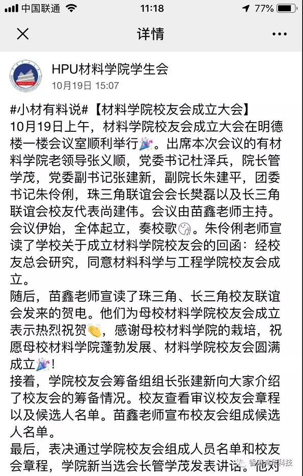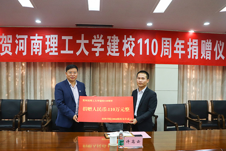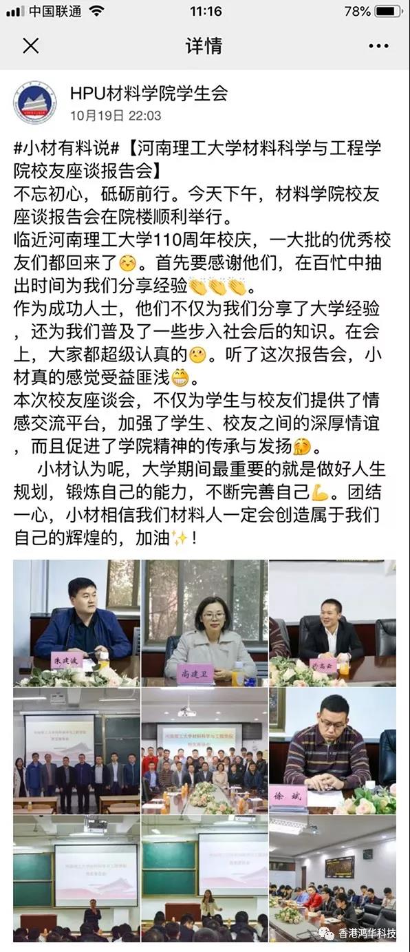 金秋十月,在偉大祖國慶祝建國70周年華誕之際,河南理工大學(xué)迎來了建校110周年慶典,一大批優(yōu)秀的校友們紛紛回校表示對(duì)母校的祝賀和感恩。鴻華科技有限公司總經(jīng)理許高云先生回到母校參加了一些列校慶活動(dòng),并向母校捐獻(xiàn)110萬元設(shè)立研究生獎(jiǎng)學(xué)金;同時(shí)鴻華科技有限公司在河南理工大學(xué)材料科學(xué)與工程學(xué)院校友會(huì)成立大會(huì)上被推選為河南理工大學(xué)材料科學(xué)與工程學(xué)院校友會(huì)理事單位。