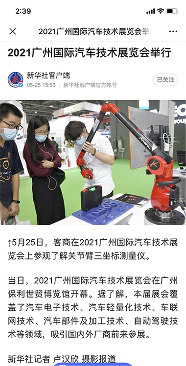 2021年5月25-27日,鴻華科技有限公司攜德國業(yè)納Jenoptik(霍梅爾Hommel)集團(tuán)工業(yè)計(jì)量儀器、法國科瑞朗KREON 關(guān)節(jié)臂三坐標(biāo)測量機(jī)/三維激光掃描系統(tǒng)、思看科技SCANTECH 手持三維視覺測量產(chǎn)品等多種智能化測量解決方案,參加2021廣州國際汽車技術(shù)展覽會,展會取得圓滿成功。