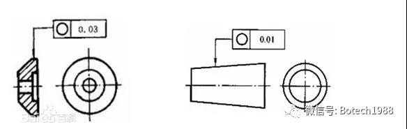 圓度是限制實(shí)際圓對(duì)理想圓變動(dòng)量的一項(xiàng)指標(biāo),其公差帶是以公差值t為半徑差的兩同心圓之間的區(qū)域。圓度公差屬于形狀公差,圓度誤差值不大于相應(yīng)的公差值,則認(rèn)為合格,下圖為圓度公差標(biāo)注圖: